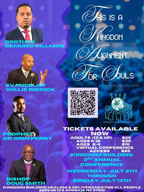 Kingdom Building Healing and Deliverance For All People is having its 3rd Annual Conference: This is a Kingdom Alignment For Souls. Conference will start Wednesday, July 9th through Sunday, July 13th. Wednesday through Friday service will start at 7pm. Saturday will start with a continental breakfast at 8:30am, a workshop at 9am, and then at 6pm we will have, A Night of Worship. Sunday will be regular service time at 9am.